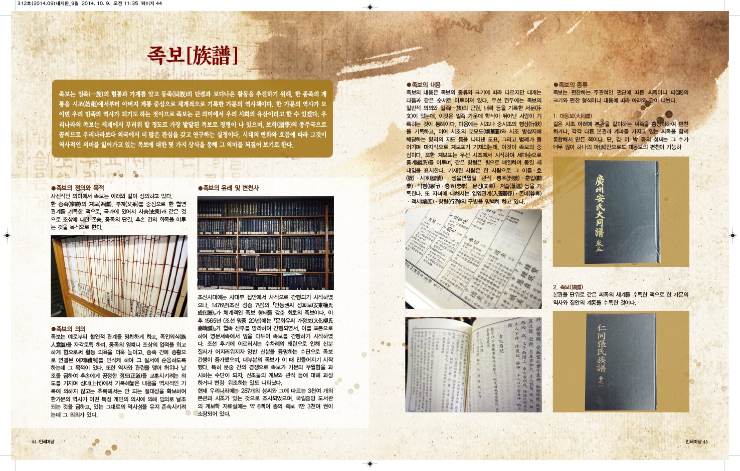 족보(族譜)는 일족(一族)의 혈통과 가계를 알고 동족(同族)의 단결과 보다나은 활동을 추진하기 위해, 한 종족의 계통을 시조(始祖)에서부터 아버지 계통 중심으로 체계적으로 기록한 가문의 역사책이다. 한 가문(家門)의 역사(歷史)가 모이면 우리 민족의 역사가 되기도 하는 것이므로 족보는 큰 의미에서 우리 사회의 유산(遺産)이라고 할 수 있겠다. 우리나라의 족보는 세계에서 부러워 할 정도로 가장 발달된 족보로 정평이 나 있으며, 보학(譜學)의 종주국(宗主國)으로 꼽히므로 우리나라보다 외국에서 더 많은 관심을 갖고 연구하는 실정이다. 시대의 변화와 흐름에 따라 그것이 역사적인 의미를 잃어가고 있는 족보에 대한 몇 가지 상식을 통해 그 의미를 되짚어 보기로 한다.