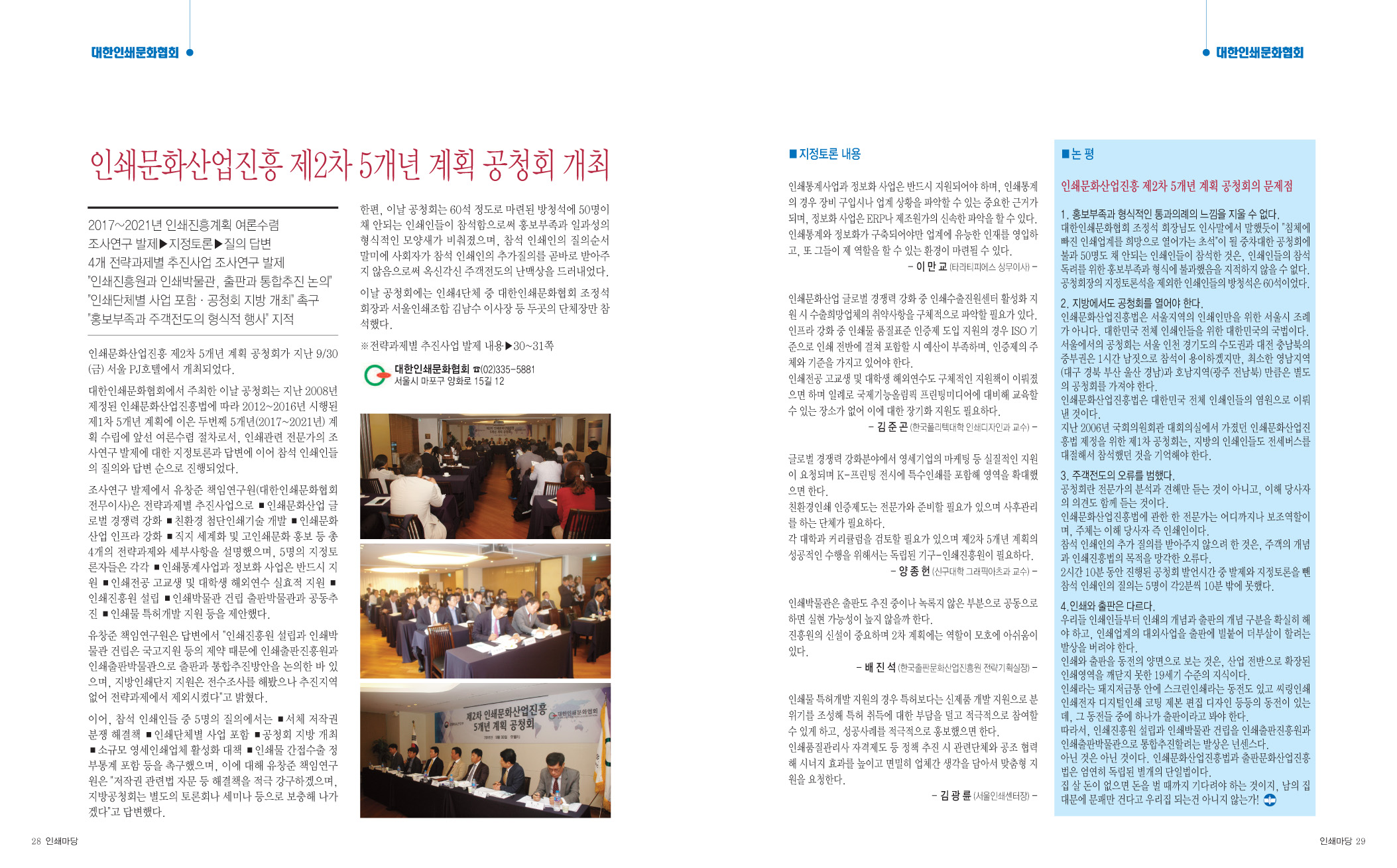 대한인쇄문화협회에서 주최한 이날 공청회는 지난 2008년 제정된 인쇄문화산업진흥법에 따라 2012~2016년 시행된 제1차 5년 계획에 이은 두번째 5년(2017~2021년) 계획 수립에 앞선 여론수렴 절차로서, 인쇄관련 전문가의 조사연구 발제에 대한 지정토론과 답변에 이어 참석 인쇄인들의 질의와 답변 순으로 진행되었다.