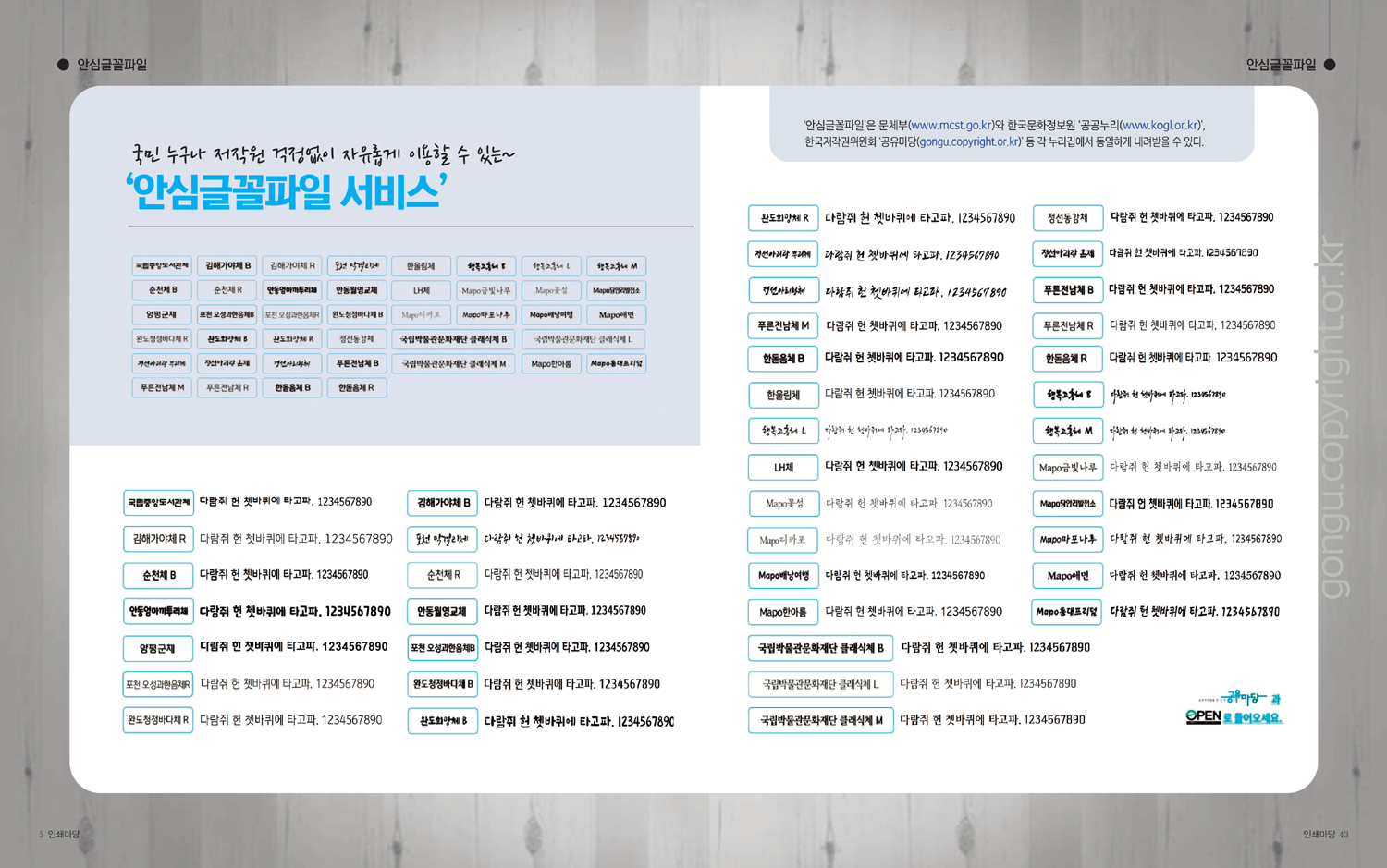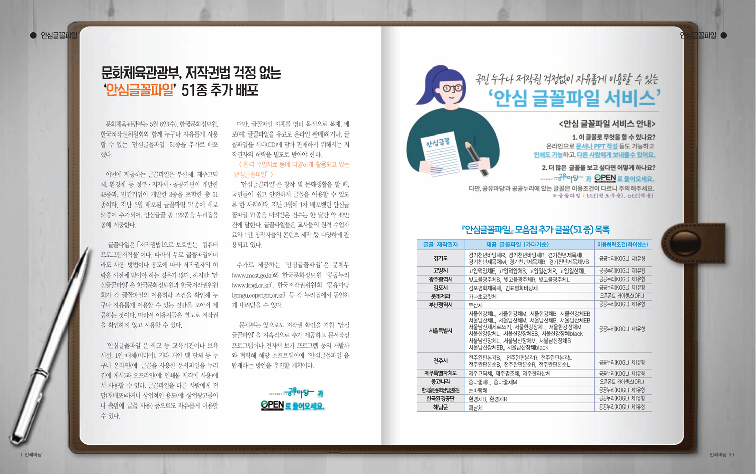 문화체육관광부는 5월 6일(수), 한국문화정보원, 한국저작권위원회와 함께 누구나 자유롭게 사용할 수 있는 ‘안심글꼴파일’ 51종을 추가로 배포했다.