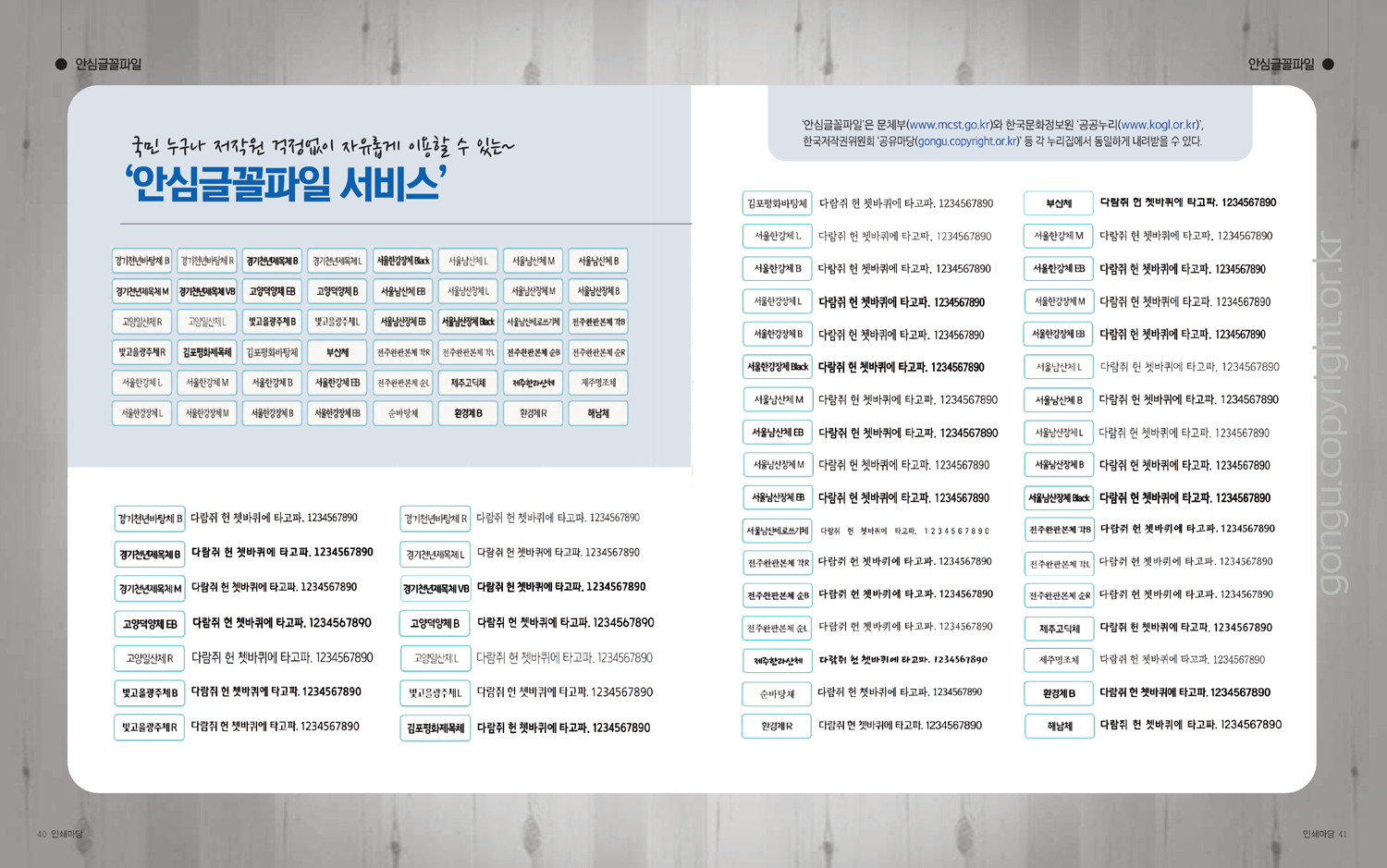 추가로 제공하는 ‘안심글꼴파일’은 문체부(www.mcst.go.kr)와 한국문화정보원 ‘공공누리(www.kogl.or.kr)’, 한국저작권위원회 ‘공유마당(gongu.copyright.or.kr)’ 등 각 누리집에서 동일하게 내려받을 수 있다.