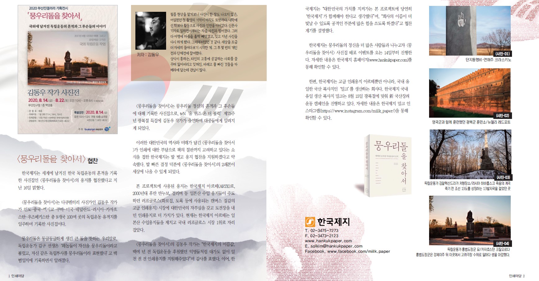 한국제지는 세계에 남겨진 한국 독립운동의 흔적을 기록한 사진집인 <뭉우리돌을 찾아서>의 용지를 협찬했다고 지난 16일 밝혔다.