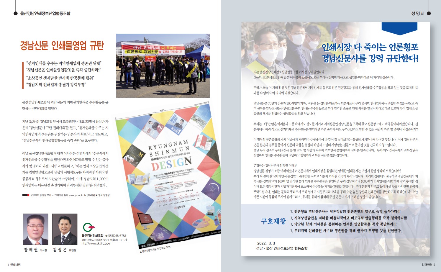 이날 울산경남인쇄조합 장태권 이사장은 성명서에서 "신문사에서 선거인쇄물 수주활동을 벌인다면 과연 NO라고 말할 수 있는 출마자가 몇 명이나 되겠느냐?"고 반문하고, "이는 영세 소상공인의 생계를 침범말살함으로써 상생의 시대적요구를 차버린 반사회적 반공동체적 행위로서 지탄받아 마땅하며, 이에 경남지역 1,000여 인쇄업체는 대동단결 총궐기하여 강력투쟁할 것임"을 천명했으며, 이어 울산경남인쇄조합 인쇄물수주분과 김성곤 위원장의 선창으로 "경남신문은 인쇄물영업활동을 즉각 중단하라!" 등 4개의 구호를 제창했다.